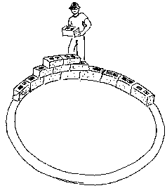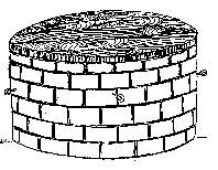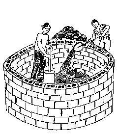 The plinth can easily be built of cement blocks. If they are hollow blocks use them upside down and fill the chambers of every course with concrete. Remove the topsoil on an area of slightly larger diameter than the tank and build a circular wall as high as needed (see Fig. 4.1). Place four steel anchors into the joint of the first or second course of the blockwork in such a way that they are opposite each other in pairs. This means one anchor at each quarter point of the circumference. They are used to fasten the tank with a steel rope. The space inside the circular wall should be filled with soil or gravel and be well compacted. Waste material is usually not suitable since it is very difficult to compact. Compaction should be done mechanically in layers not exceeding 300 mm, see Fig. 4.2. If possible the filled-up plinth should be compacted by water as well. Only after the filling is very well compacted should a concrete layer not less than 50 mm be applied. The top of the concrete must be flat, level and smooth.