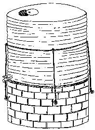 Every corrugated iron tank must be fixed in position with steel ropes or heavy 16-gauge fence wire. The larger the tank the greater the risk of storm damage if the tank is empty and not tied down to the plinth (see Fig. 4.4). A tank supplied by two gutters is shown in Fig. 4.5.