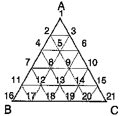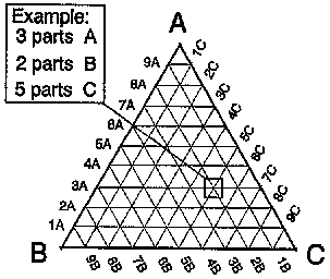 From your first set of line blends choose three coloring oxides and test their combinations in a biaxial blend. When setting up the biaxial blend, make the points A, B and C with oxide additions about 30% higher than what you expect to use in the final glaze.
