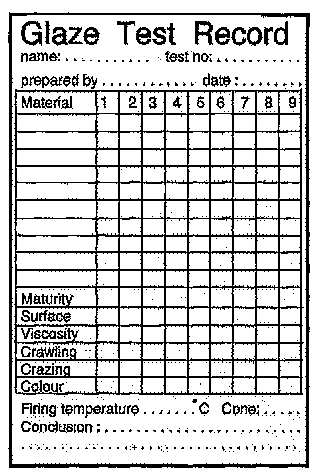 - An area for labeling. It is best to write the full recipe of the test on each test tile (with a brush and iron oxide and water, or chrome oxide or engobe etc.) since code numbers often get confused and notebooks get lost.