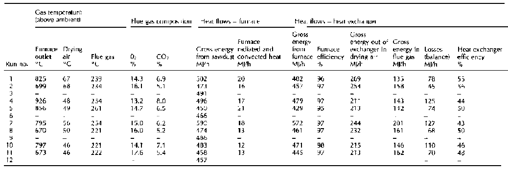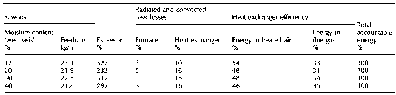 Efficient combustion was sustained and controlled at sawdust moisture contents of up to 40%. Trials at sawdust moisture contents of 50% gave poor combustion with smoky exhaust emissions. Energy balances are shown in Table 4. Radiated and convected heat losses from the furnace ranged from 3% to 5%. The energy recovered, taking into account furnace and heat exchanger radiated and convected heat losses and the energy contained in the flue gas, ranged from 46% to 54%. The lower efficiencies were experienced at the higher moisture contents.