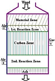 The advantage of co-current and counter-current gasifiers are combined in a so a called twin-fire gasifier. It consists of two defined reaction zones. Drying, low-temperature carbonisation, and cracking of gases occur in the upper zone, while permanent gasification of charcoal takes in lower zone. The gas temperature lies between 460 to 520 o C. Total process takes place with under pressure of -30 mbar. Twin-fire gasifier produces fairly clean gas. |