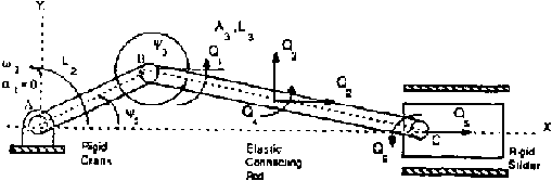 As an example the physical model and notation selected for the analysis of an in-line slider-crank mechanism are shown in Figure 8. The crank-shaft is rotating at a constant angular velocity and there is no energy dissipation in the system, due to either friction or material damping. The fiber-reinforced connecting rod is the only elastic link of the mechanism (Figure 9); other links are made of steel and considered rigid. A large-mass flywheel is presumed to be attached to the crank-shaft in order to keep its angular velocity constant.