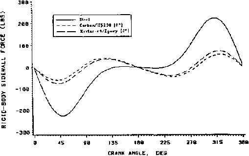 These results indicate an upper limit for such benefits as they correspond to unidirectional fiber orientation along the connecting rod axis, which is the optimal lay-up for the particular loading case considered here. Lower benefits should be expected for different lay-ups which may be required by more general loading conditions. Besides mass characteristics, elasto-dynamic oscillations of the side-wall force magnitude are governed in this model primarily by the extensional and flexural stiffness of the connecting rod along its longitudinal axis. Since steel is stiffer than fiber-reinforced composites selected for this investigation, the elasto-dynamic benefits of using composite, rather than steel, connecting rods are due to reduced inertia effects.