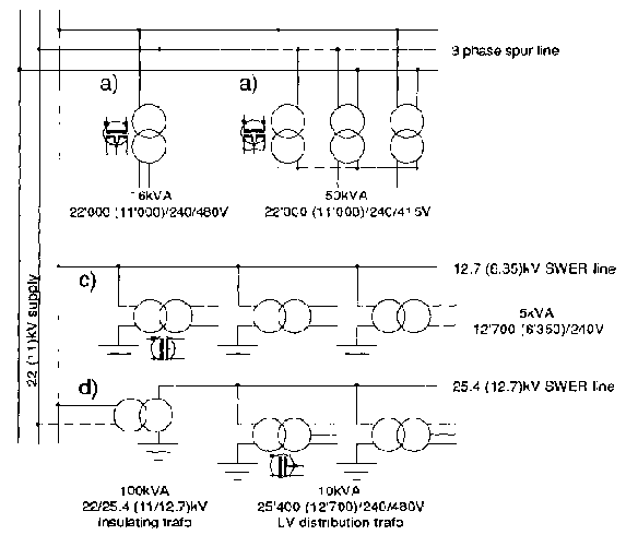 kVA) SWER system c) directly tapping the HV line(5 kVA) d) with single phase
