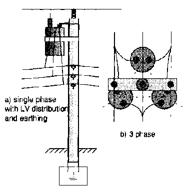 The 22 (11)kV single phase transformer would be similar except that it would have two HV bushings. It would be possible to use three such transformers to give a three phase supply. The secondary winding would be paralleled in this case (refer to Fig 4a). Three transformers can be mounted on a single pole by spacing them equally around it.