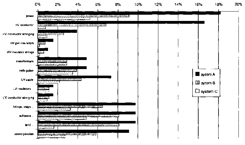 concepts A, B and C. All categories are displayed in percent of System's A total