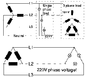 A three wire system uses only the 3 phase wires (Ll,L2, L3). Therefore, only the phase voltages (voltage between two phases) are available. Is the generator delta-connected, the phase voltage is 220V and normal single phase appliances can be connected between any two phase conductors. Three phase motors, however, are not readily available for a 220V phase voltage and would have to be specially wound. This might be the main reason why three wire systems are rarely used in low voltage (LV) systems. Though in high voltage (HV) distribution they are often found because of the obvious benefit: one wire less reduces the conducter costs by 25%.