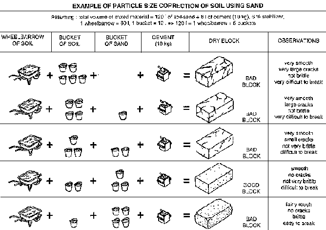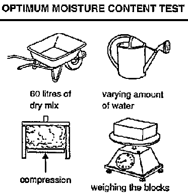 Testing: approximately 20 blocks are made for each differing proportion, making sure that the moisture content is at the optimum (using the drop test). The freshly moulded blocks are examined: if they are cracked when the moisture content is optimum, the proportions used are rejected. Blocks which are in good condition when freshly moulded are allowed 2 to 3 days of wet curing and one day's drying. At that point, the proportions resulting in the best blocks are retained.
