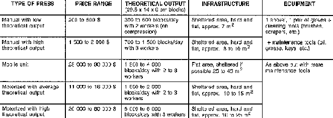 Compression is of course the key operation in the manufacture of CEBs. Nevertheless, the quality of the product will depend heavily on what "goes into" the press (the type of soil and all the preliminary operations: preparation, mixing, retention time, etc.) as well as the way in which the products are going to be treated when they come out of the press (curing, storage, transportation, etc.) The various types and qualities of presses available obviously have some impact, but they are not necessarily crucial to the final result, the CEB.