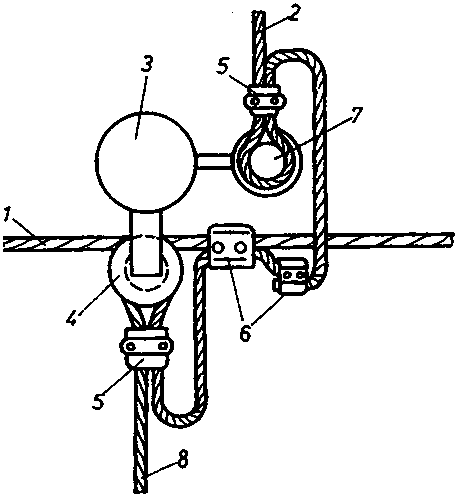 1 main line (lower groove at insulator), 2 branch of service tap, 3 pole, 4 shackle insulator, 5 clamps for terminal binding joint, 6 tapping clamps, 7 pin insulator, 8 further branch