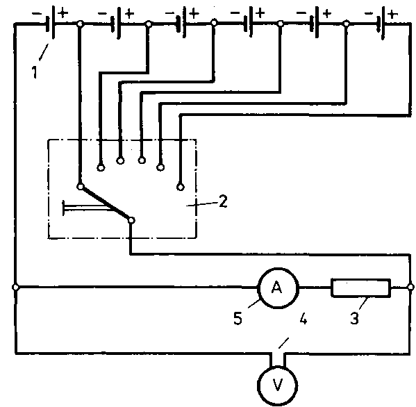 · An adjustable voltage source; this may be an accumulator with six cells each of which provides 2 V voltage so that a total of 12 V are available;· a voltage selector switch with six switch steps;