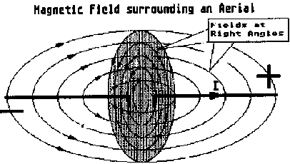 Besides this electric field, there is also a magnetic field, which is generated by the aerial current. The plane of this magnetic field is at right angels to the direction of the current flow; and therefore is at right angles to the aerial (see below), the electrical and the magnetic fields are therefor at right angles to each other.