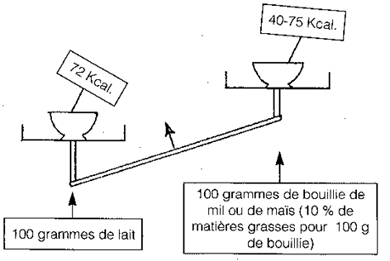 Les limites des bouillies traditionnelles Au Congo, les mères donnent aux enfants en période de sevrage des bouillies qui sont le plus souvent préparées avec de la farine de manioc ou bien avec une pâte de mais fermentée appelée poto-poto. Ces bouillies remplissent l'estomac de l'enfant et lui coupent momentanément l'appétit, mais elles ne sont pas très nourrissantes. La plupart du temps, leur densité énergétique est inférieure à 60 Kcal pour 100 ml, soit moins que le lait. De plus, elles sont pauvres en protéines, en vitamines, en sels minéraux... Parmi les enfants de 4 à 7 mois qui mangent régulièrement de la bouillie, seulement 26 % en zones rurales et 21 % à Brazzaville en consomment plus de 2 fois par jour. Source: Trèche, 1992. |
