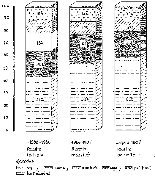 A partir de 1986, la formule est simplifiée. Le lait en poudre qui provenait de dons et rendait la production dépendante de l'extérieur a été supprimé, de même que les sels de fer et d'iode qui donnaient une bouillie très instable à la cuisson. La pâte d'arachide, difficile à mélanger avec la farine, a été remplacée par des arachides grillées et moulues.