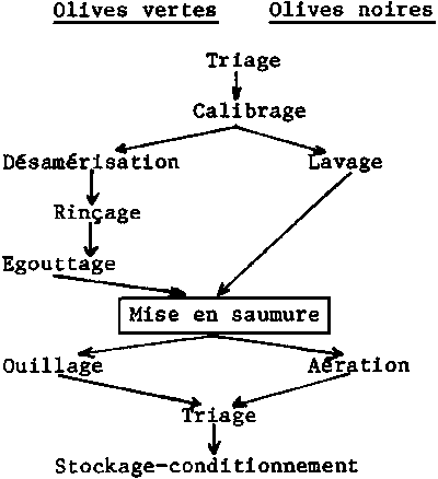 Cette transformation s'applique aux olives noires, c'est-à-dire cueillies au stade de maturité (couleur violet-noir). Les principales étapes en sont représentées dans la figure 68.