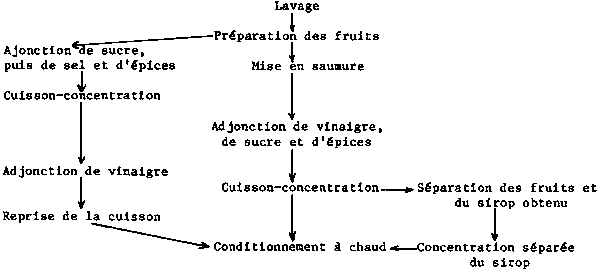 - On peut traiter tout d'abord les fruits avec du sel en forte concentration (15 pour cent au moins), sans ajouter de vinaigre. A cette teneur, tout développement microbien est inhibé, et il n'y a donc pas de fermentation dans le produit. Le sel est l'agent de conservation.- On peut également traiter les fruits avec une solution saline à une concentration d'environ 8 à 10 pour cent, ce qui permet le développement sélectif d'une certaine catégorie de micro-organismes (les bactéries lactiques) et autorise une fermentation. Ces bactéries vont transformer les sucres fermentescibles des fruits en acide lactique. Cet acide, ainsi que l'acide acétique provenant du vinaigre que l'on ajoute également aux fruits, inhibe le développement d'autres micro-organismes nuisibles, tels que les bactéries productrices de spores, les bactéries protéolytiques et les organismes pectolytiques. Ce sont donc ici les actions combinées du sel et du vinaigre qui assurent la conservation du produit fini.