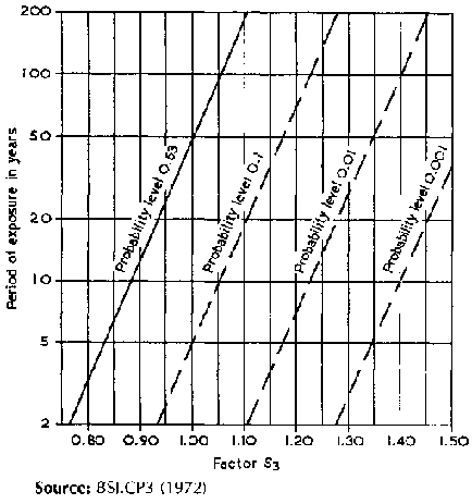 where V = the 3-second basic gust speed, from local meteorological data (see Table 1); S1 is a topographical factor, normally = 1; S2 is a factor embracing ground roughness, building size and height above ground; and S3 is a statistical factor which can be obtained from Figure 3. The probability P that a wind speed of greater value will occur at least once in a period of N years is normally taken as P=0.63. Taking a five-year Ifie as a reasonable exposure period for an emergency store, Figure 3 gives S3=0.83. Lam and Lam (1985) suggest that 3-second gust speeds are adopted as the basis for building design because the natural oscillation period for most structures is only a few seconds, but Robertson (1988) states that 3-second gust speeds are used primarily because of limitations in the response of wind-measuring instrumentation. Research findings support the use of quasi-static loadings - even for plastic film greenhouses. Initial indications are that gusts of about 3 seconds or longer are appropriate design gusts depending on the size of the structure or member in question.