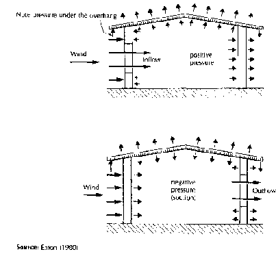 Judicious placing of such openings can ensure that internal forces are always suction forces and therefore reduce total roof and wall loads except for the windward wall, for example by placing a ridge ventilator on a low pitch roof (BSI 1972, Eaton 1980).