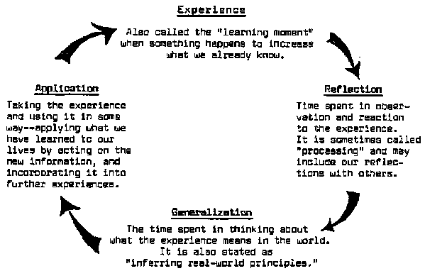 An illustration: A child approaches a hot stove and tentatively puts a hand out to feel what is there. As his hand touches hot metal, he withdraws it and cries out in pain. He thinks, on some level, "stoves are hot, they burn and cause pain." Next time (or however many times it takes to make the connection), he is cautious about touching stoves and may not even want to go near one, hot or cold, for a long time. First, there was the experience of burning and pain; then, of reflecting and sharing feelings (calling out to mother); then of generalizing stoves are hot, and applying that knowledge to the next experience. It may be that the child will find out that all stoves are, in fact, not hot, and that he will have to be cautious only when he knows (through observation, experience, and second-hand information) that the stove is lit.