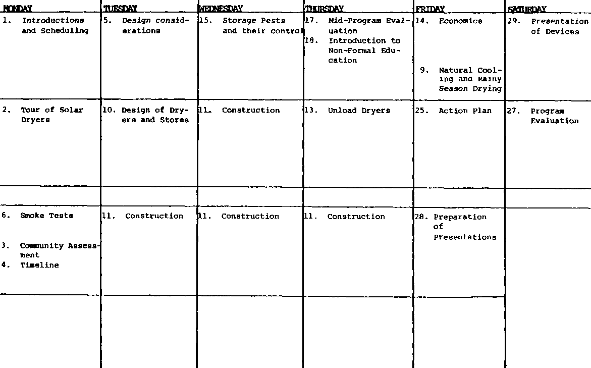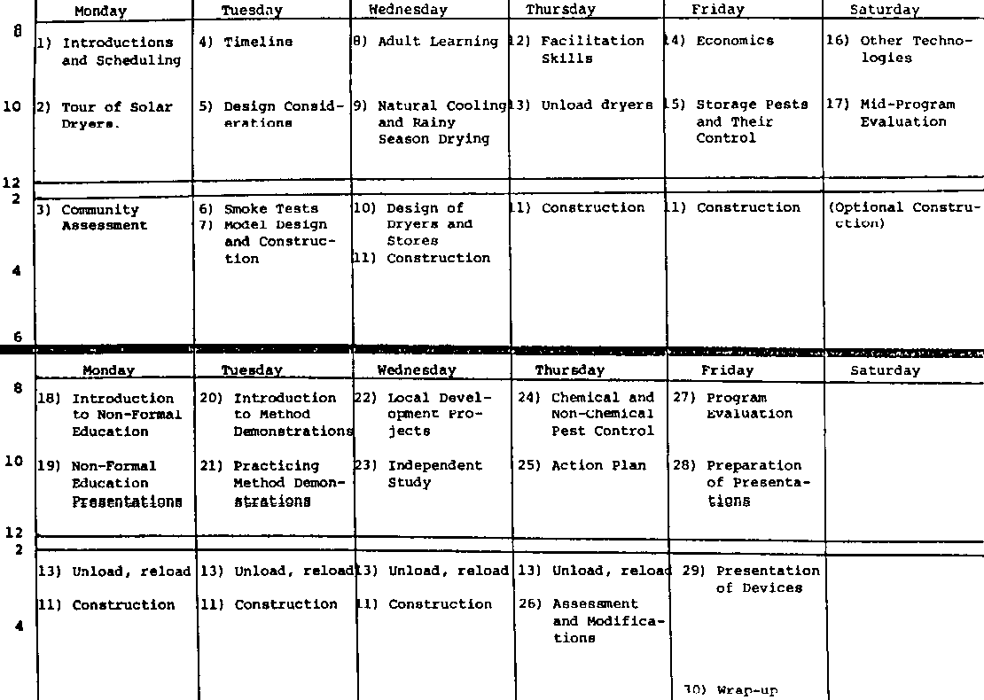 7. provide flexibility, scheduled into a seemingly structured program. Sessions 22, 23 and 24 might be continuations of Sessions 19 or 21, either at the training site or in a nearby village. Sessions 24 and 26 could be used to finish behind-schedule dryer or store, although this might want to be discouraged. The optional sessions can be scheduled in where and when deemed necessary by the participants and trainers. The Participant's Notebooks should already contain the Optional Session's Handouts.