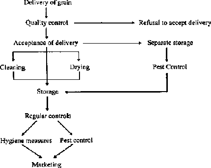 Bulk storage in warehouses and silos is a system whose strengths lie particularly in rapid and labour-saving turnover of produce. The system enables relatively simple and efficient pest control measures and may considerably simplify transport tasks. The transit silos found in ports are typical of this usage. The relatively sophisticated bulk storage system demands, however, a high degree of management qualities, in particular with respect to loss prevention as a result of moist grain and condensation problems.