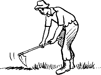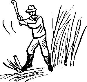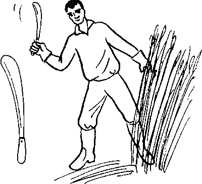 A machete can be used for cutting hard-stem grasses and woody weeds. It is a long knife, also used for many other purposes, such as cutting fence posts, trimming live fences and root pruning. The machete weighs about 0.6 kg. The traditional machete has a handle of 0.1-0.15 m and a blade of 0.45 m in length. For grass-cutting a modified model has been developed. On the grass-cutting machete the length of the handle is about 0.5 m and the blade about 0.3 m. A grass-cutting machete is used with one hand and the long handle allows the worker to maintain an upright position. Productivity can be increased if the cutting is assisted by a wooden stick (see fig).