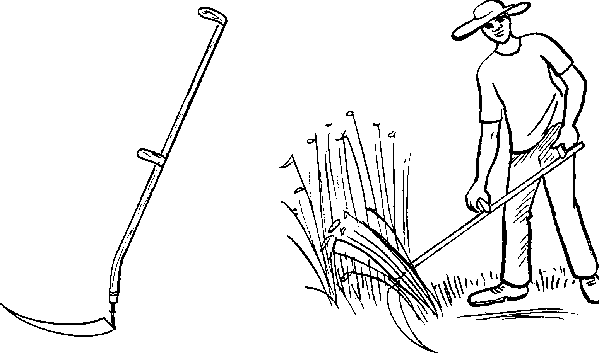 A scythe is useful for soft stem grasses. A scythe with a short blade (0.3 m) is chosen when the terrain is rough and the grass dense. In even terrain a longer blade (0.6 m) can be used. This will speed up the work. It takes some training to get used to the scythe, but once the technique is mastered productivity is good. The worker should stand with his back straight and feet apart. To give power to the cutting swing, the muscles of the thighs and the back should be used. The hands are used mainly for guiding the swing, not for powering it. A well designed scythe is adjustable to individual preferences and body sizes. In the middle of the handle there is a grip for the right hand, and at the top there is another grip for the left hand (for right-handed workers). The upper handle should reach the arm pit and the lower should be placed one underarm's length lower.