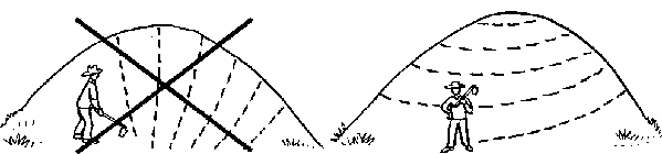 The work should be carried out along the contour line, not up and down the slope, otherwise rain water may start to wash away the soil and form gulleys.