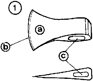 The axe consists of a steel head fitted to a wooden handle. The most important part of the head (1) is the blade (1a), ending in the edge (1b). The wooden handle is fitted into the eye (1c). Modern axes are shaped like a wedge and have an oval eye which prevents the handle from turning in the eye.