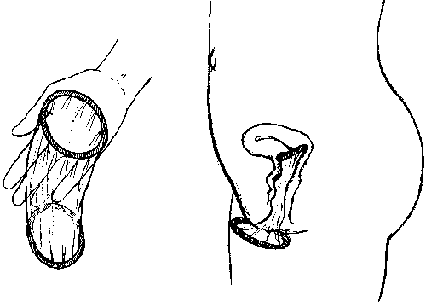 Description: The female condom is a relatively new form of contraception which is still not available in many areas. It is a thin rubber sheath with two flexible rings, one attached to each end (see Figure 17.2). One ring, at the closed end of the sheath, is placed inside the woman's vagina similar to the way a diaphragm would be inserted, and serves as an anchor. The other ring at the open end of the sheath stays outside the vagina and partially covers the lips of the vagina. It is used once and then thrown away. It also offers some protection against sexually transmitted diseases.
