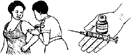 Description: Injectable contraceptives contain progestogen. An injection is given every two or three months, depending on the type, either in the woman's arm or buttocks (see Figure 17.6). The hormones in injectables prevent pregnancy by causing changes in a woman's body similar to those caused by progestogen-only pills (see above). Injectables can be used while breastfeeding the baby, since they do not decrease breast milk. They do have certain side-effects, however. These include: