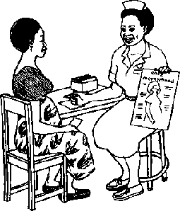 Information from the personal history, physical examination, and laboratory tests can be used as the basis for a discussion about what the woman can and should do to stay in good health (see Figure 7.5). She should be encouraged to ask questions or talk about any special problems she might have. Some women may be shy about asking questions; the health worker can help by using simple, understandable language to explain what was done and what the findings mean. It is especially important to explain any danger signs or complications the woman may have, and what should be done about them (see Chapters 9 and 11). In addition, basic information should be offered on nutrition, danger signs, personal hygiene, typical discomforts and what to do about them, and the baby's stage of development (see Chapters 4, 6, and 8).