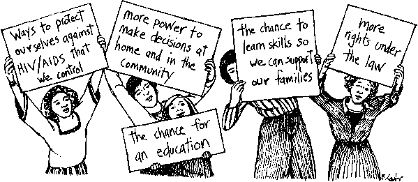 Here is an example of how women can work together to protect themselves from AIDS: To help fight the spread of AIDS, the women of Palestina, a small town in northeastern Brazil, began a sex strike. After women in the community learned that a man infected with HIV had unsafe sex with at least two women in the town, they decided to stop having sex with their husbands and boyfriends. They demanded that their partners take the test for HIV before they would begin to have sex again and then insisted upon safer sex practices. The women will now demand safer sex and proof of an HIV test before they have sexual relations with a partner One woman said, If he wont practice safer sex, we wont go together anymore. |