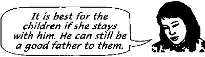 The truth: It is not always better for the family when a woman stays with a violent man. He is teaching the children terrible, wrong ways to deal with their feelings, and about how women should be treated. He is not being good to his children if he is beating their mother - or them.