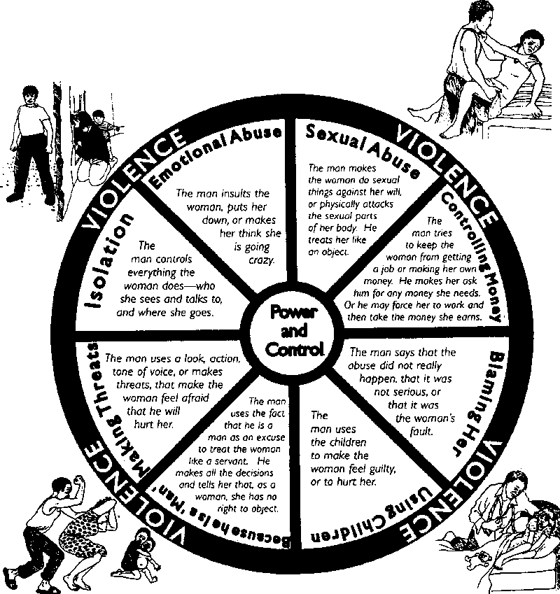 Imagine that the circle below is a wheel. Power and control are at the center of the wheel because they are the reasons behind all of the actions. Each section of the wheel is a behavior that a violent man may use to control a woman. Violence is the rim of the wheel - what holds it together and gives it strength.