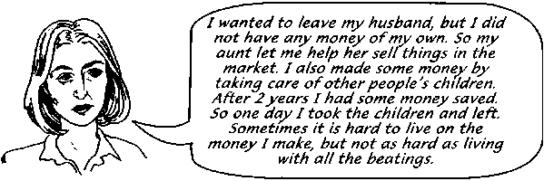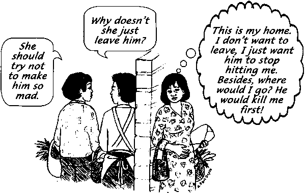 When Laura got pregnant, she thought Luís would start treating her better. But it seemed to give him more excuses to hurt her. When he got angry, he started hitting and kicking her in the stomach. She was terrified she would lose the baby, but she had no place to go. She believed Luís when he said her family did not want her, and besides, she had no money of her own. There were times when Luís would go several weeks without losing control, and Laura would convince herself that everything was OK. He really did love her, after all. If only she could learn how to avoid setting him off. She would try even harder than before, but nothing helped. Through the years, Luís drank too much, threw her against walls, and would force her to have sex even when her body ached from his beatings. Laura awoke one night to find him holding a knife to her throat. The next day, he told her she was imagining things, that she was crazy. He always said that if she told anyone lies about him he would kill her She didnt tell anyone and she went out as little as possible. She hated the thought of anyone seeing her bruises and knowing what he did to her Laura often thought about: leaving, but she did not know where to go. After 12 years of being his wife, not only was Laura afraid of what he would do to her, but without him she would have no home, no money, no father for her children. Luís had said bad things about her to the people at the store where she used to work, and she knew that, because of her children, no one would take her in as a domestic servant. Laura felt so alone. Lauras father was dead now and her mother lived with her brothers family. They did not have room for her and her children. Her sister was deeply religious and told Laura it was her duty to stay with her husband, even if she were killed. That is the way it is meant to be. She had so much work to do at home she was always busy. And since Luís got mad when she went out or when someone came to visit, Laura stopped seeing her friends. She was sure they had long since given up on her. Besides, most people thought that it was okay for men to punish their wives. Then came the night when Lauras oldest daughter was 11. She came to Laura crying, saying Luís had hurt her down there. Laura was shocked. She had thought the children would not be affected by Luís behavior. She knew it would do no good to confront him, but she would NOT let it happen again. When Laura lost her last pregnancy, the health worker who examined her asked about her injuries. Laura had made some excuse. The health worker nodded her head and gave Laura a card with an address in the next town. She told her if Laura ever needed to leave, she and her children could go there, but to make sure that she was ready to leave when she did. Laura was ready now. |