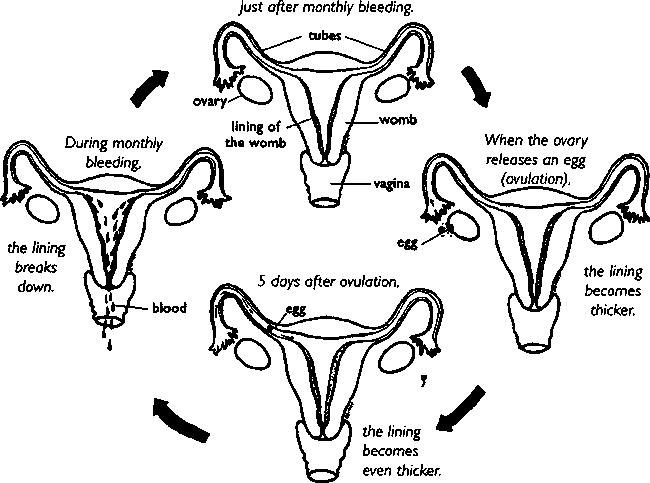 In addition, during the years she can have a baby, her body changes every month - before, during, and after the time of her monthly bleeding. The parts of the body where many of these changes happen are the vagina, womb, ovaries, fallopian tubes, and the breasts, also called the reproductive system. Many of the changes are caused by special chemicals called hormones.