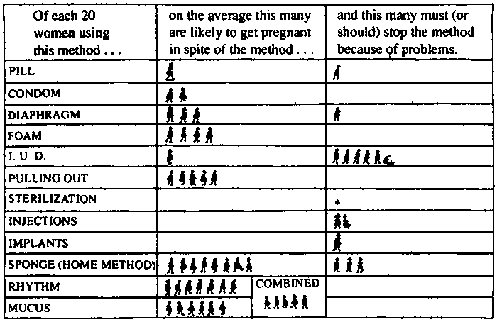 On the following pages several methods of birth control are described. Some work better for some people than others. Study these pages, and talk with your midwife, health worker, or doctor about what methods are available and are likely to work best for you. Differences in effectiveness, safety, convenience, availability, and cost should be considered. Husbands and wives should decide together, and share the responsibility.