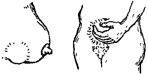 Every day, except during her period, the woman should examine the mucus from her vagina. Take a little mucus out of your vagina with a clean finger and try to make it stretch between your thumb and forefinger, like this: