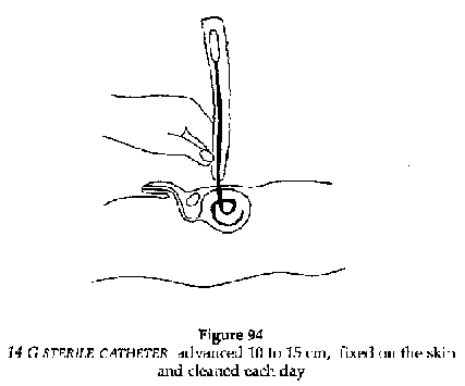 · Introduce the perforated drain: advance 10 to 15 cm of the catheter, remove the trocar and attach the catheter to a sterile urine container.