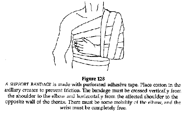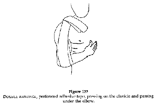 Immobilise by applying a sticky bandage (perforated adhesive tape), crossed and double thickness under the elbow.
