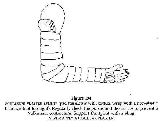 It is sometimes difficult but necessary to have an X-ray. If this is not possible (no evacuation possibilities, no hospital) and in doubtful cases, it is better to immobilise the fracture in a posterior plaster rather than in a full circular plaster. For example, in children when a forearm fracture is suspected, for which only an X-ray will confirm the diagnosis, a splint maintained with a bandage will produce good results, and with no risk.