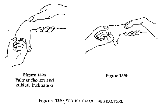 · Reduction under general anesthesia or local/regional anesthesia. Local anesthesia is possible following rigorous aseptic technique. Inject 10 ml of 1% lidocaine into the hematoma of the fracture. The left hand of the operator takes the patient's fingers and applies axial traction. The thumb of the right hand presses on the back of the bent fork deformity. Then, flex the palm of the hand and incline it cubitally (Figures 139a, 139b).