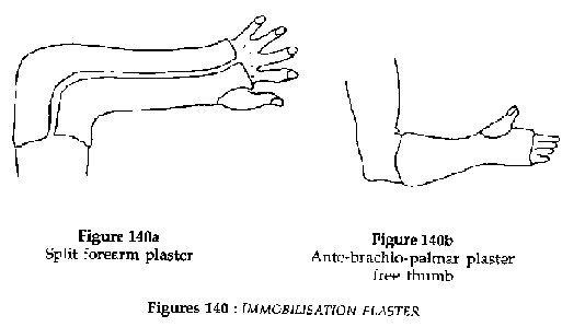 · Immobilisation for 30 days in a forearm plaster, the wrist in a neutral position. This plaster must leave the metacarpal phalangeal joint of the thumb free and should reach the metacarpal phalangeal joints of the other fingers (Figure 140a). If surveillance of the plaster cannot be assured, do not cover the elbow with the plaster (Figure 140b).