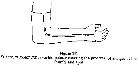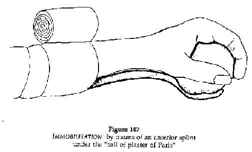 · Immobilisation plaster (Figures 136,137) Elbow at right angles, protected in the flexural fold with cotton, the hand midway between pronation and supination, the plaster covering the brachiopalmar surface as far as the metacarpal joints, leaving the fingers free. IMMEDIATELY SPLIT THE PLASTER. Immobilisation: 3 months for an adult, 45 days for a child.