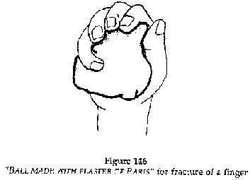 · Immobilisation using a "ball made with plaster of Paris": the operator makes a ball out of plaster and it is held in the palm of the hand. The fractured finger is strapped to the ball with an adhesive tape. In cases of a fracture of a metacarpal, the ball is first fixed to an anterior forearm splint which is held in position with a bandage leaving the fingers free.