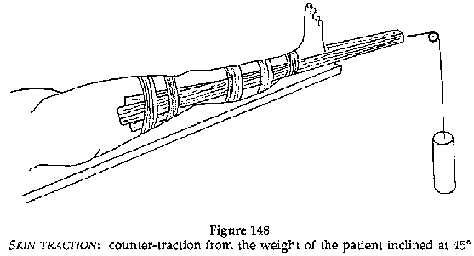 The board is attached to a cord which is suspended, by weights of 1/7 body weight, on a pully. Traction should be in the axis of the limb, counter traction coming from the patient resting in bed at an angle of 45° to the horizontal.