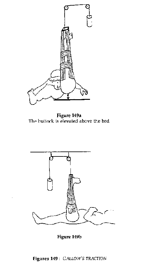 The same principal as for skin traction in the adult, but the limb is suspended vertically by a weight equivalent to 1/7 of the child's body weight, the buttock elevated above the lying position (gallow's traction).