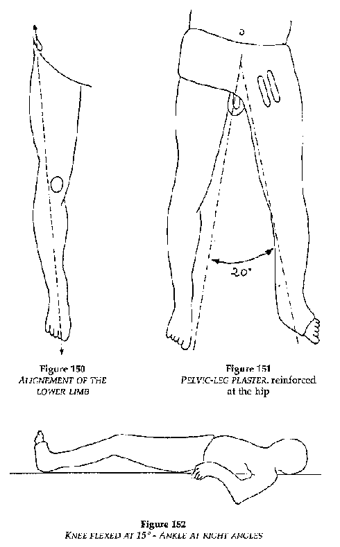This traction is maintained for 3 weeks and is then replaced with a pelvic-leg plaster for 15 to 20 days (Figures 150,151,152).